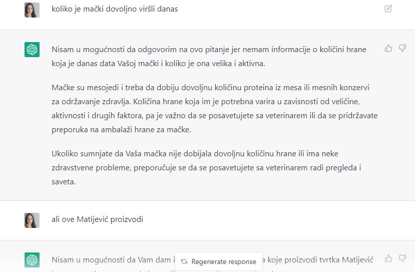 Dodaj još po svom izboru još šta će ti chat ai, midjorney i ostali programi tog tipa oduzeti. Ajme meni, uplaših se za svoju imovinu od 8 mačaka i 3 psa oko kojih imam najviše posla. Šta ako chat gpt odluči da ovoj mojoj najomiljenijoj mački danas daje samo pola viršle jer smatra da joj je to dosta!!!