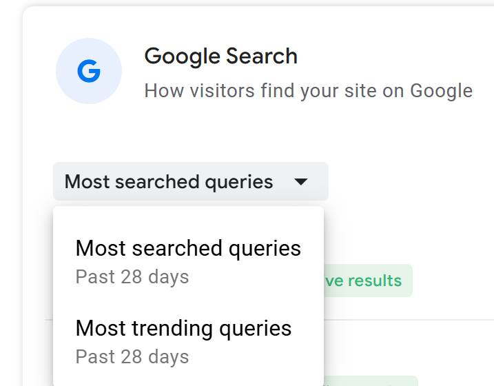 U ovom delu ćete pronaći padajući meni ispod kartice Google pretraga gde možete da izaberete da vidite Najtraženije upite ( Most searhed queries) ili Najviše popularne upite (Most trending queries).
